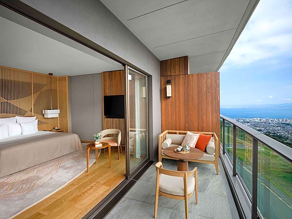 This spacious suite features Beppu Bay and Ogiyama mountain views. A private bath is available on the terrace. A handcrafted-sliding doors separate the bedroom and living area.