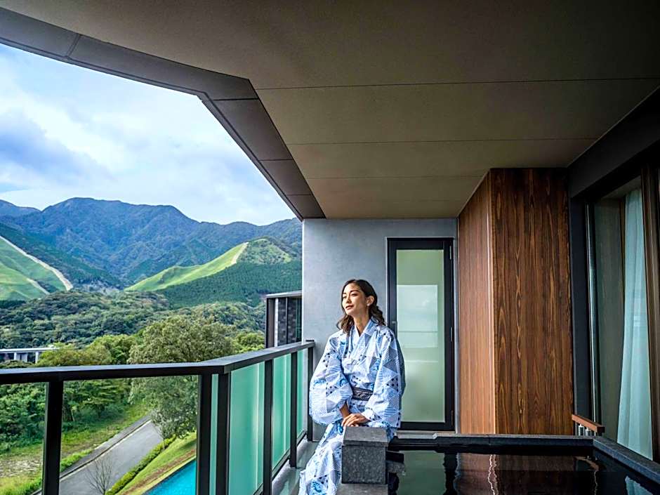 This double room features contemporary Japanese-designs and handcrafted bamboo decorations. The room is fitted with floor-to-ceiling windows with a view of Ogiyama mountains. There is a sofa on the private terrace with views.