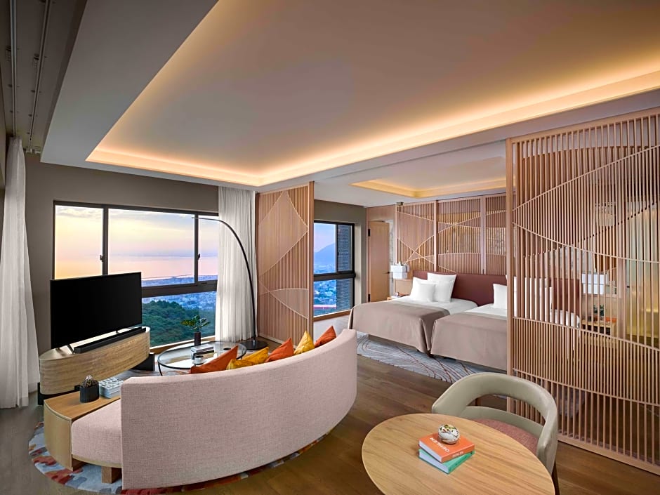 Featuring contemporary Japanese-designs and handcrafted bamboo decorations, this spacious twin room has a private bathroom fitted with marble flooring. A flat-screen TV and Bluetooth speakers are provided. Guests staying in this room get access to the hot spring bath, swimming pool and fitness center.
