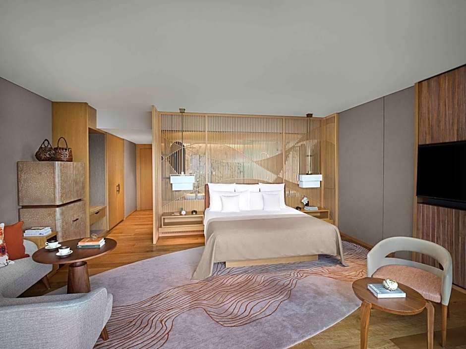 This spacious corner suite with lounge area and large windows offers a private bath on the terrace. Featuring contemporary Japanese-style designs and handmade decorations, the room includes sliding doors between the bedroom and living area.
